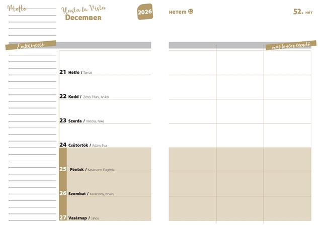 oldalak, 108 oldal heti beosztású naptár (2026. augusztus - 2027. augusztus), 14 oldal olvasmányok, tippek, tapasztalatszerzés, fontos dátumok, és egyéb történések rögzítésére alkalmas segítő táblázatok, 8 oldal vonalas és kockás jegyzetoldalak